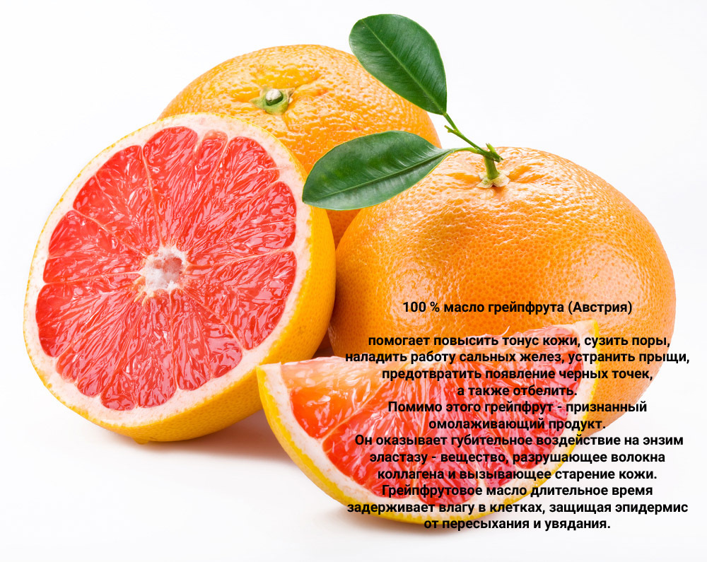 100% эфирное масло грейпфрута - помогает бороться с пигментными пятнами, улучшает цвет лица. Стягивает расширенные поры, делая кожу более гладкой. Придает коже свежесть, упругость. Масло грейпфрута признанный омолаживающий продукт. Оказывает губительное воздействие на энзим эластазу – вещество, разрушающее волокна коллагена и вызывающее старение кожи. Длительное время задерживает влагу в клетках, защищая эпидермис от пересыхания и увядания.